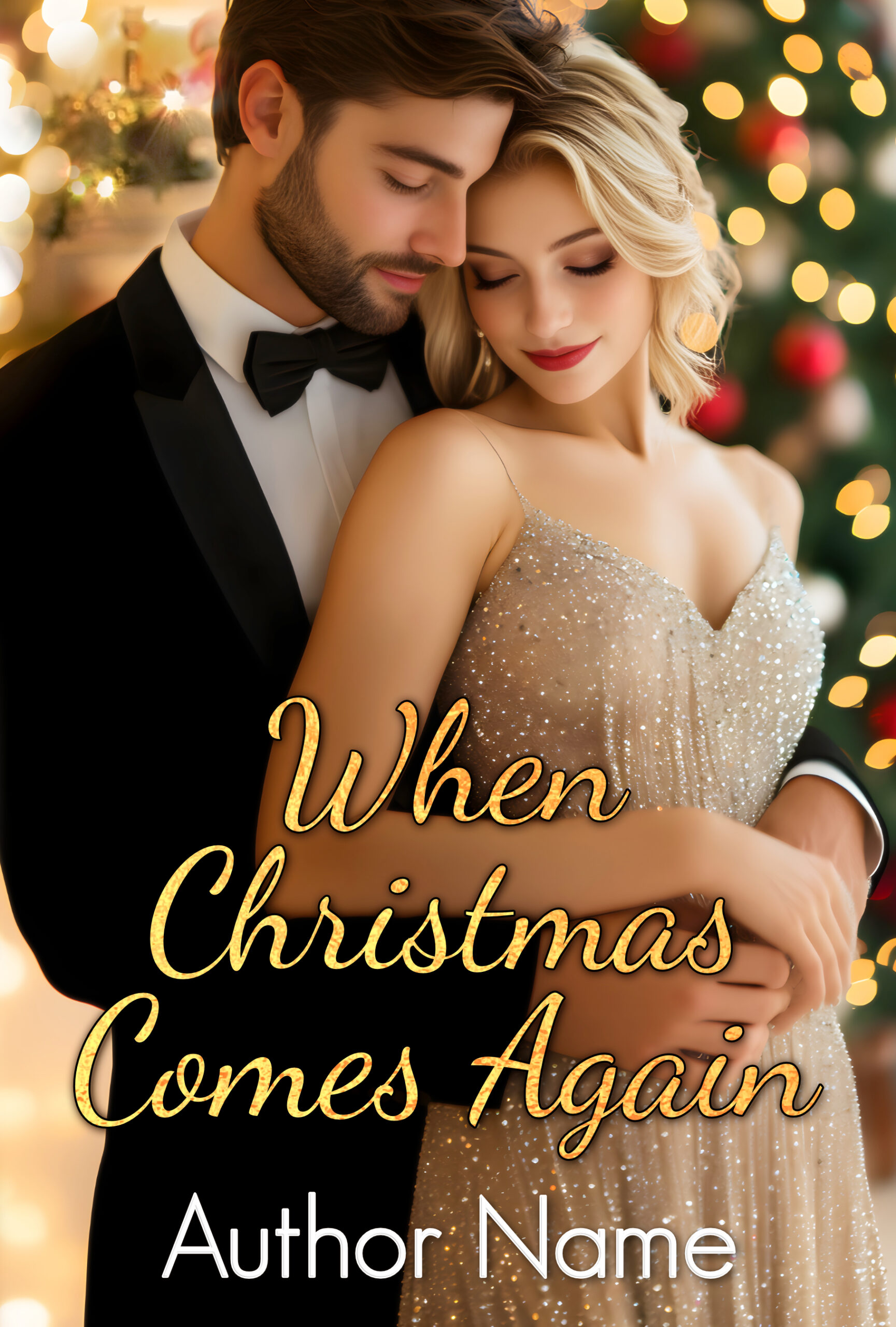 This enchanting design captures an intimate moment between a beautifully dressed couple framed by glowing Christmas lights and festive warmth. Soft golden bokeh, rich seasonal colors, and tender body language evoke nostalgia, forgiveness, and love rediscovered beneath the sparkle of the holidays.